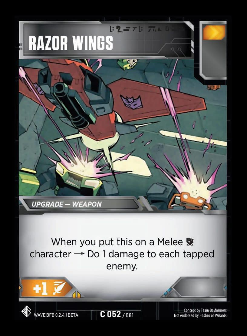 Opportune Offensive (BL, B)(3): This card can be played because I have a Decepticon (Axor) and Mercenaries on my team. I can play it on Axor to get +3 ATK and Pierce 3 until the end of the turn.